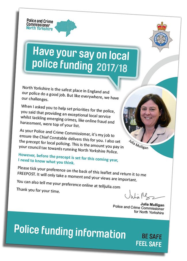 North Yorkshire’s Police and Crime Commissioner is responsible for setting the local police ‘precept’ – the amount people pay through their council tax for policing.