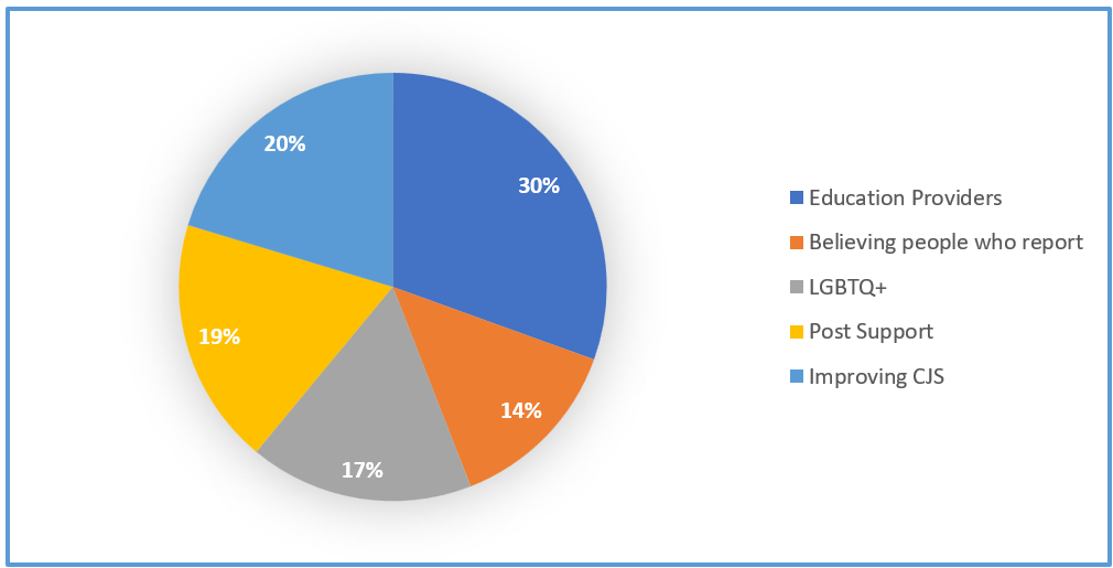 Around 21% of comments referenced the use of language and terminology connected to gender and sex; around half of these were in relation to the difference between biological sex and gender identity and the need for sex-specific safe spaces for females. The majority of the remaining comments were around the need to recognise men and boys as victims too, and women as perpetrators; however, one respondent stated that they appreciated the trans- and gender-inclusivity of the language used.