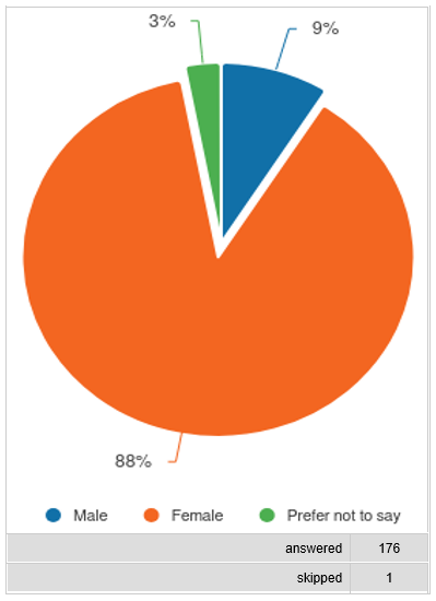 88% of respondents were female (AFAB), and no-one identified as transgender or non-binary however one respondent skipped the sex question and two respondents choose to skip the gender identity question. This is a slightly higher proportion (+8%) of female respondents when compared to the 2022 survey.